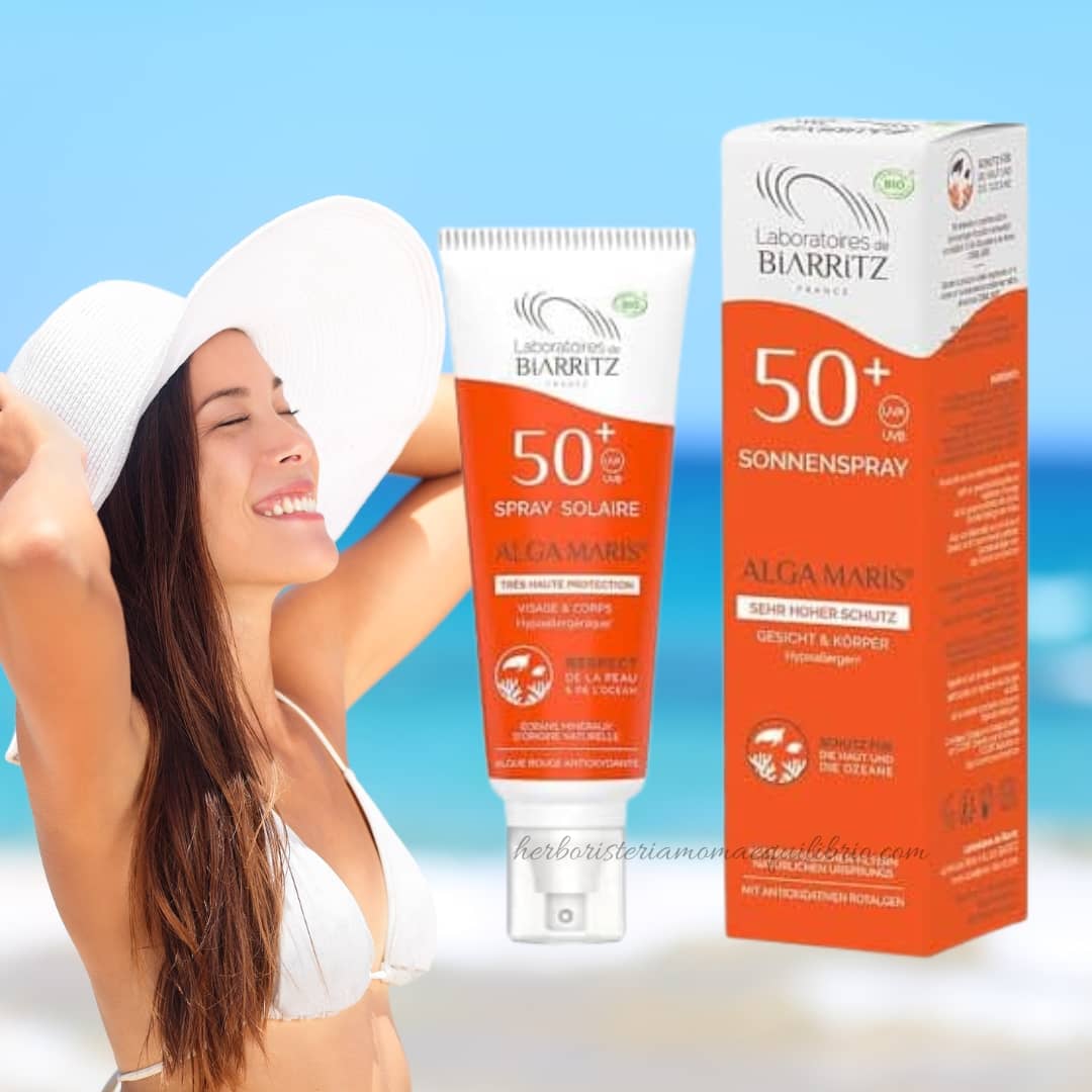 Spray protector solar Cara y Cuerpo SPF 50+ de Alga Maris, resistente al agua y de textura fluida para una efectiva protección de todo el cuerpo y cara.